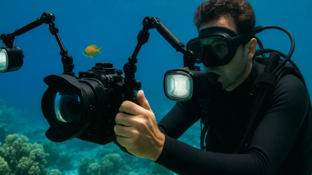 - Iluminação externa: luzes subaquáticas com ajuste de intensidade ajudam a recuperar cores perdidas em profundidade.